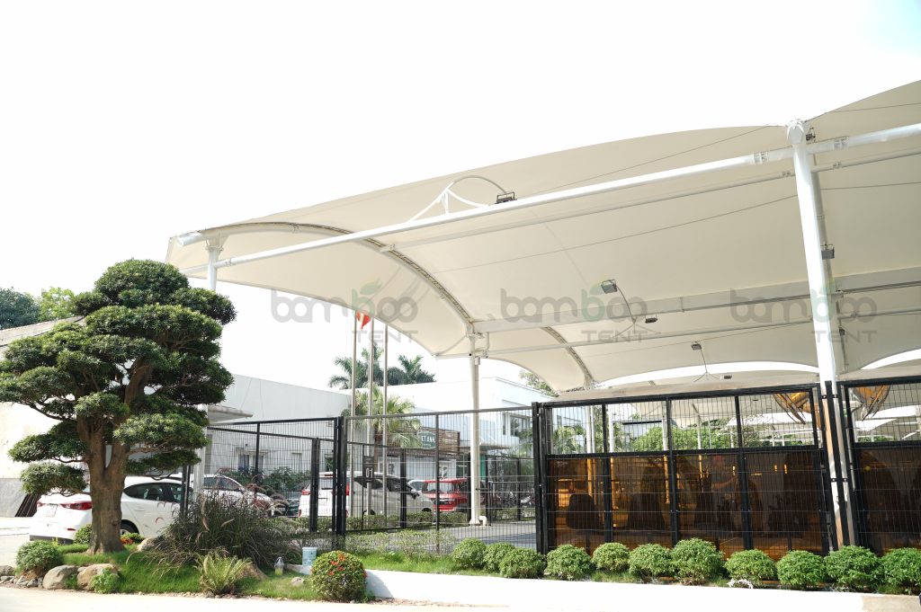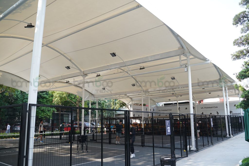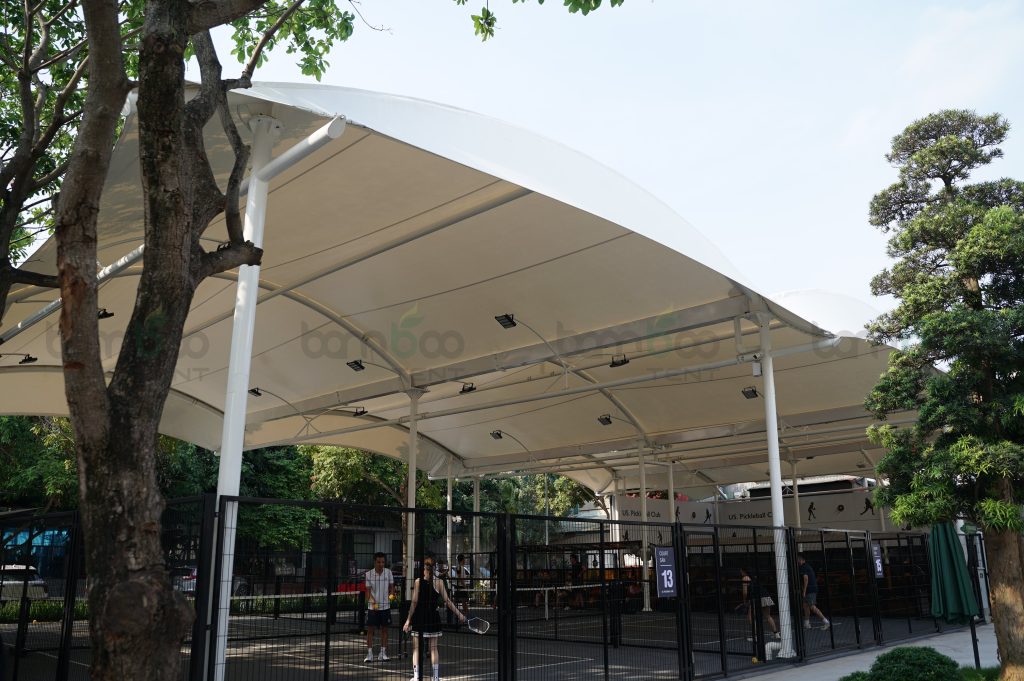 Bambootent sử dụng mái bạt căng PVDF cho các sân Pickleball. Đây là vật liệu có tuổi thọ cao, chống tia UV và chịu được gió mạnh. Bề mặt bạt có khả năng tự làm sạch, giúp công trình luôn sáng đẹp. Đặc biệt, vật liệu này nhẹ, dễ uốn cong, tạo hình linh hoạt cho nhiều kiểu mái khác nhau.